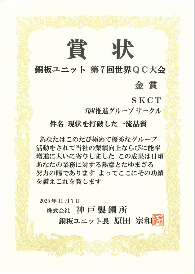 2025年11月,在日本长府制造所举办的铜板单元第7回世界QC发表大会上,我司代表团队凭借以“打破现状的一流品质”为主题的创新管理成果,脱颖而出,荣获大会金奖。此次获奖不仅是对我司长期坚持质量精进及管理创新的充分肯定,更展示了公司上下凝聚力与敢于突破自我的进取精神。